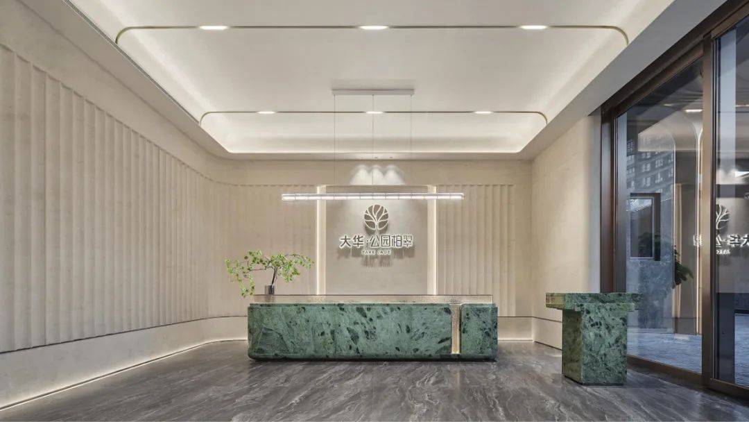 整座大堂外墙采用伯爵灰大理石满铺高墙,电动门镶嵌宝格绿奢石,实现无感通行;