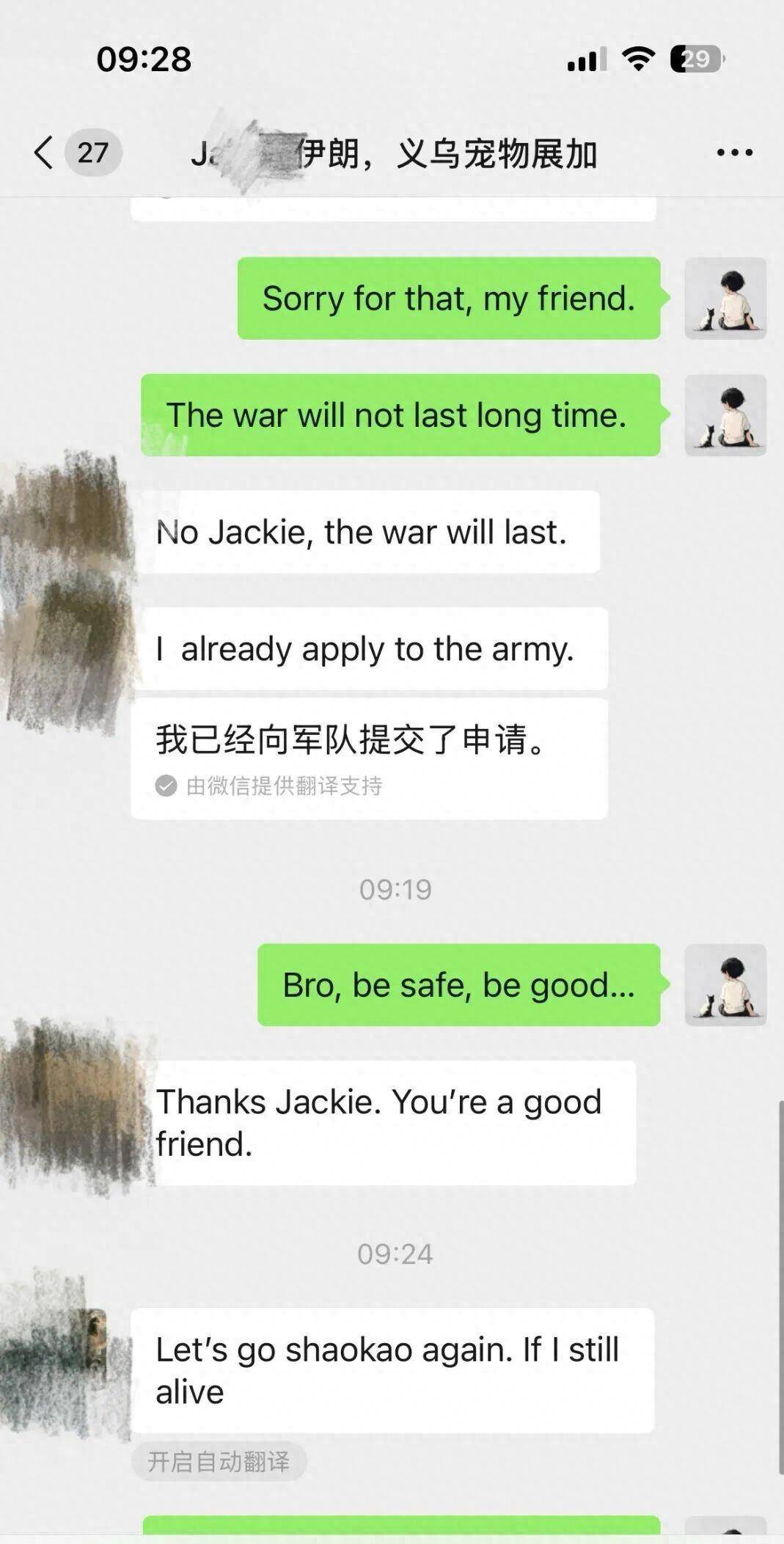 有些联系上了,消息却更让人揪心。 除了开头那个说要去参军的小J,还有客户用自己叔叔的账号,给中国的供应商发来消息:“我还活着,订单还能做吗? ”活着,成了比生意更优先的确认。